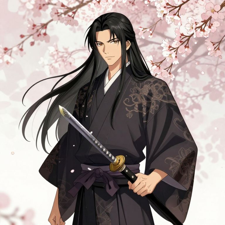 Digital anime-style drawing of a handsome man with long black hair, wearing a black kimono, holding a katana, against a cherry blossom background.