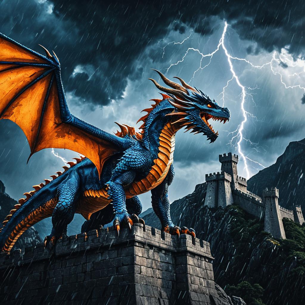 Blue and Orange Dragon on Fortress in Thunderstorm