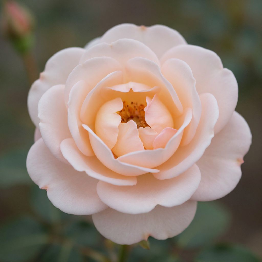 Photograph of a fully bloomed, pale peach rose with soft, delicate petals. The rose's center reveals a small, star-shaped dark brown stamen surrounded by lighter, cream-colored petals. The petals have a smooth texture and slightly ruffled edges. The background is blurred with dark green and brown hues, emphasizing the rose's delicate, bright color. The image focuses sharply on the rose, creating a bokeh effect in the background. The overall composition highlights the rose's intricate, symmetrical beauty and soft color gradient.