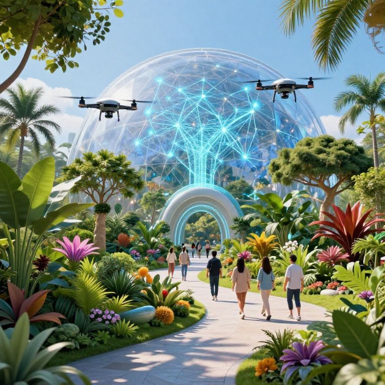 Midjourney AI aipark illustrating a visionary eco-park, with AI-powered drones planting and maintaining exotic plants, glowing neural networks as canopy patterns, and visitors in futuristic attire enjoying a blend of nature and artificial intelligence under a crystal-clear blue dome.