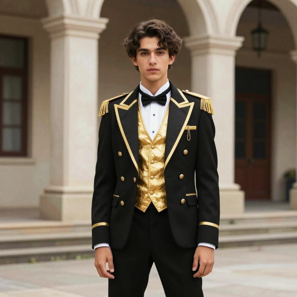 Photograph of a young man with fair skin and dark, wavy hair standing in front of a classical building with arched windows and columns. He wears an elaborate, black and gold military-style coat with gold trim and buttons, a gold brocade vest, a black shirt, and a gold tie. His expression is neutral, and he stands with his arms relaxed at his sides. The background is slightly blurred, emphasizing the detailed costume. The image has a polished, staged look, typical of fashion photography.