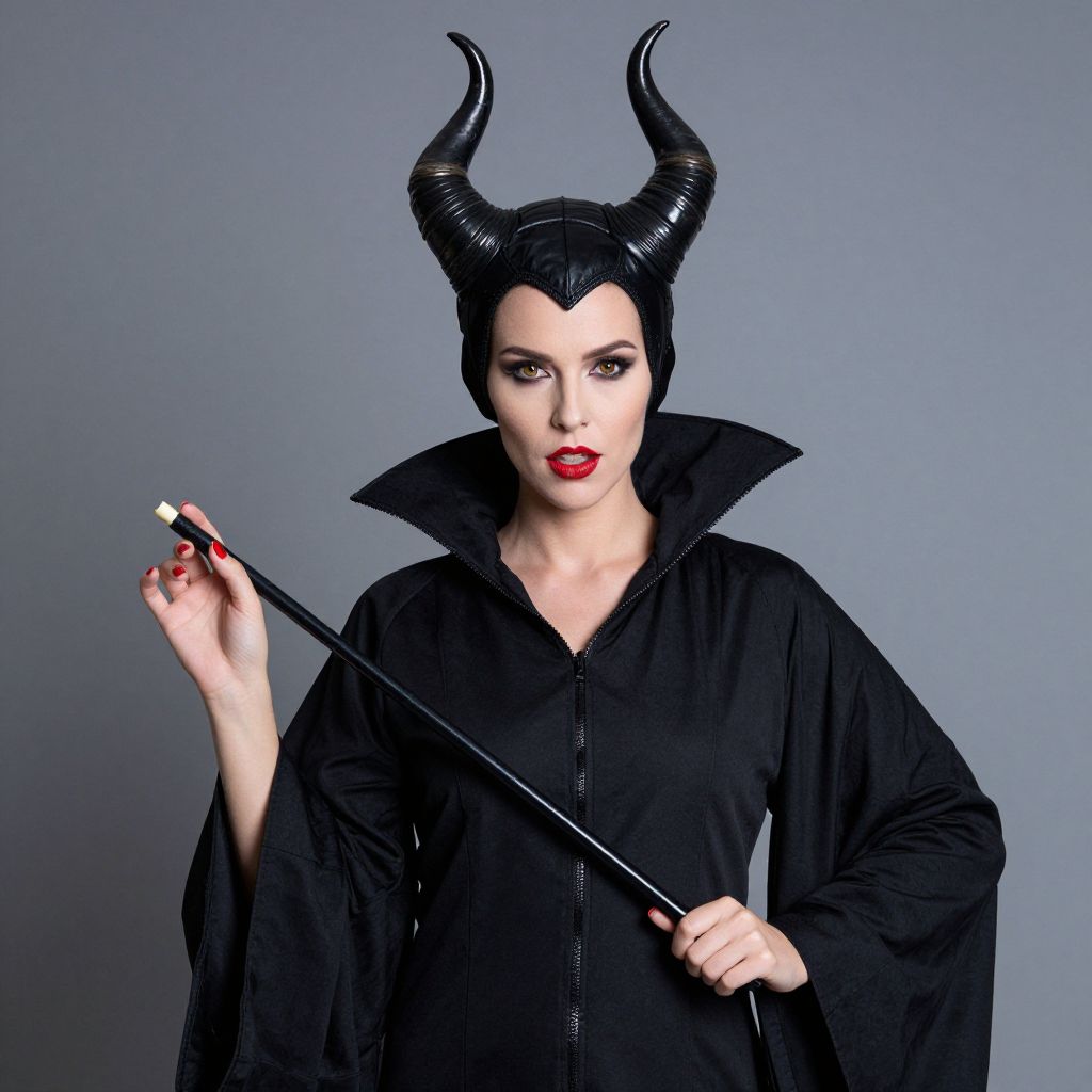 Adult Maleficent Halloween Costume, maleficent in black with horns and red lips