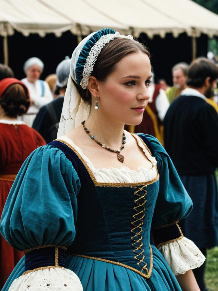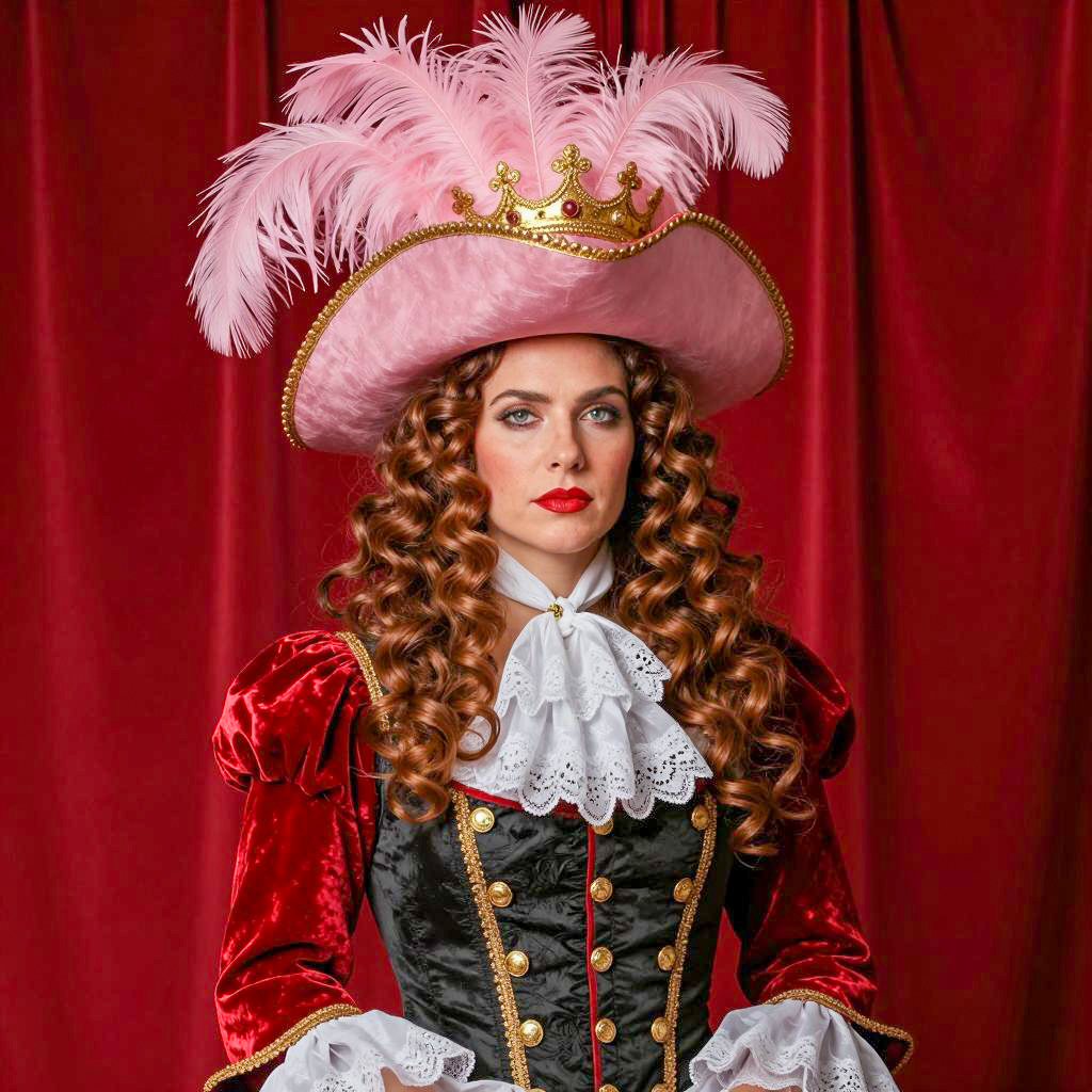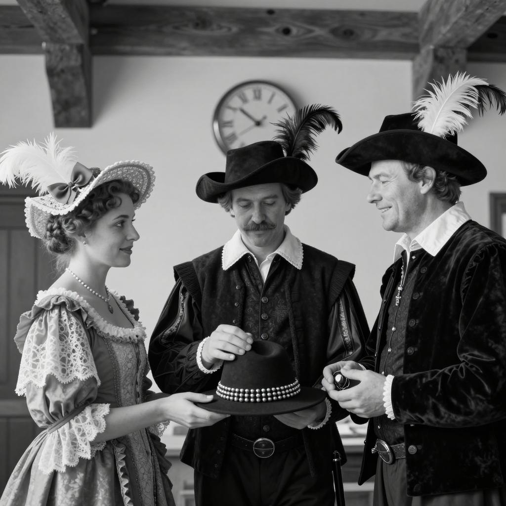 Black-and-white photograph of three people in 16th-century attire. Center man with mustache, dark vest, and feathered hat holds black, beaded hat. Woman on left in lace dress and hat, hands out beaded hat. Man on right in dark velvet jacket, feathered hat, holds small object. Clock on wall behind them. Woman and man on right smile. All stand indoors, with wooden beams in background.