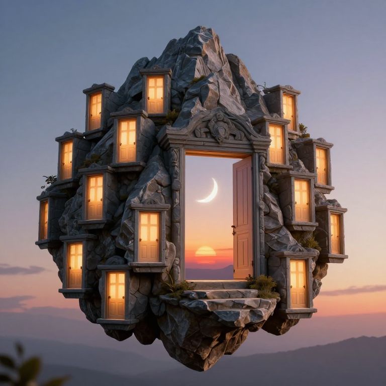 A surreal 3D-rendered structure resembling a rugged mountain is crafted entirely from floating stone-like doors, each emitting a warm, inviting glow, with the central doorway revealing a breathtaking sunset and a crescent moon, evoking a sense of mystery and wonder in a high-definition, otherworldly landscape.
