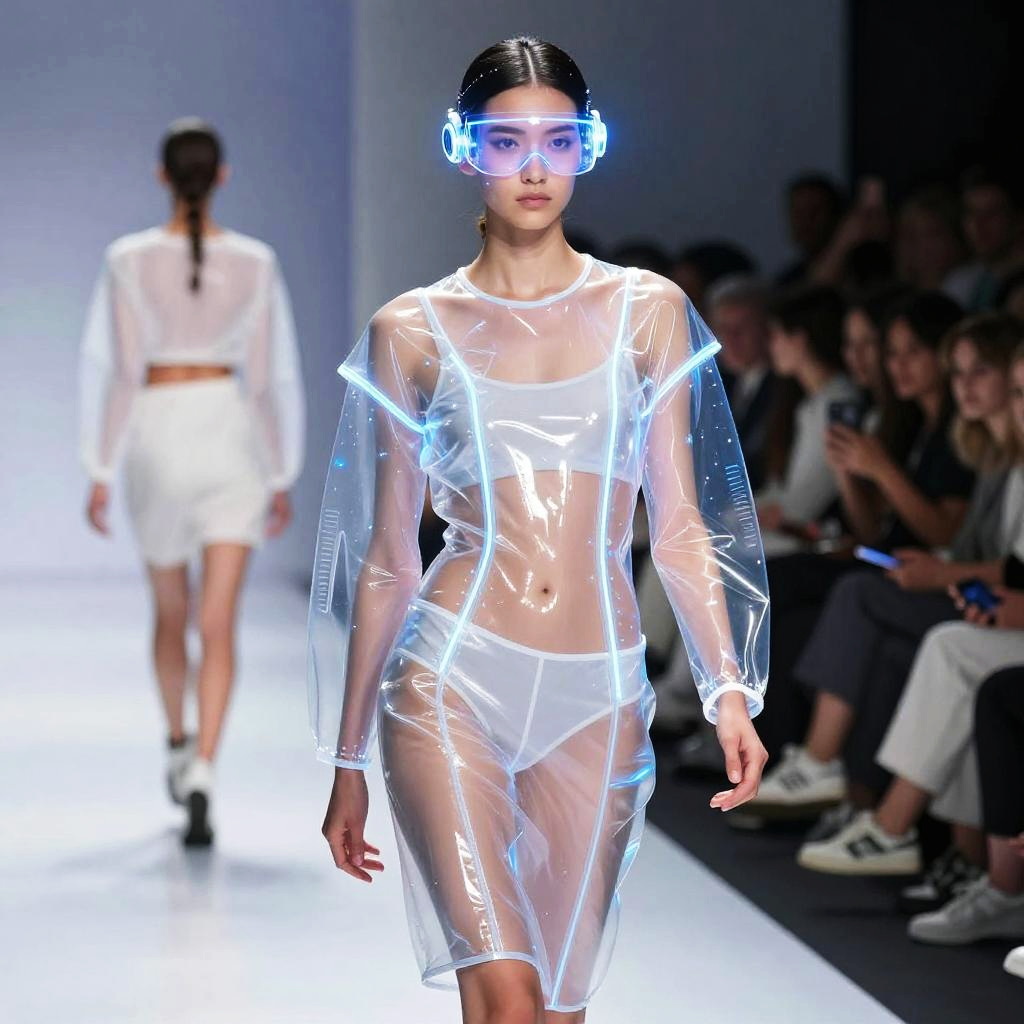 Xray clothes AI visualization showing futuristic see-through fashion technology on a runway model, blending augmented reality and cybernetic enhancements, high detail, neon blue and white colors, sleek modern style
