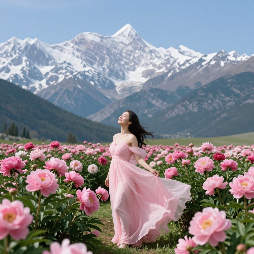 Amidst a sea of vibrant pink peonies and the majestic backdrop of snow-capped mountains, a woman in a flowing pink gown stands as a symbol of timeless beauty and serenity, her presence radiating joy and hope against the eternal rhythm of nature.
