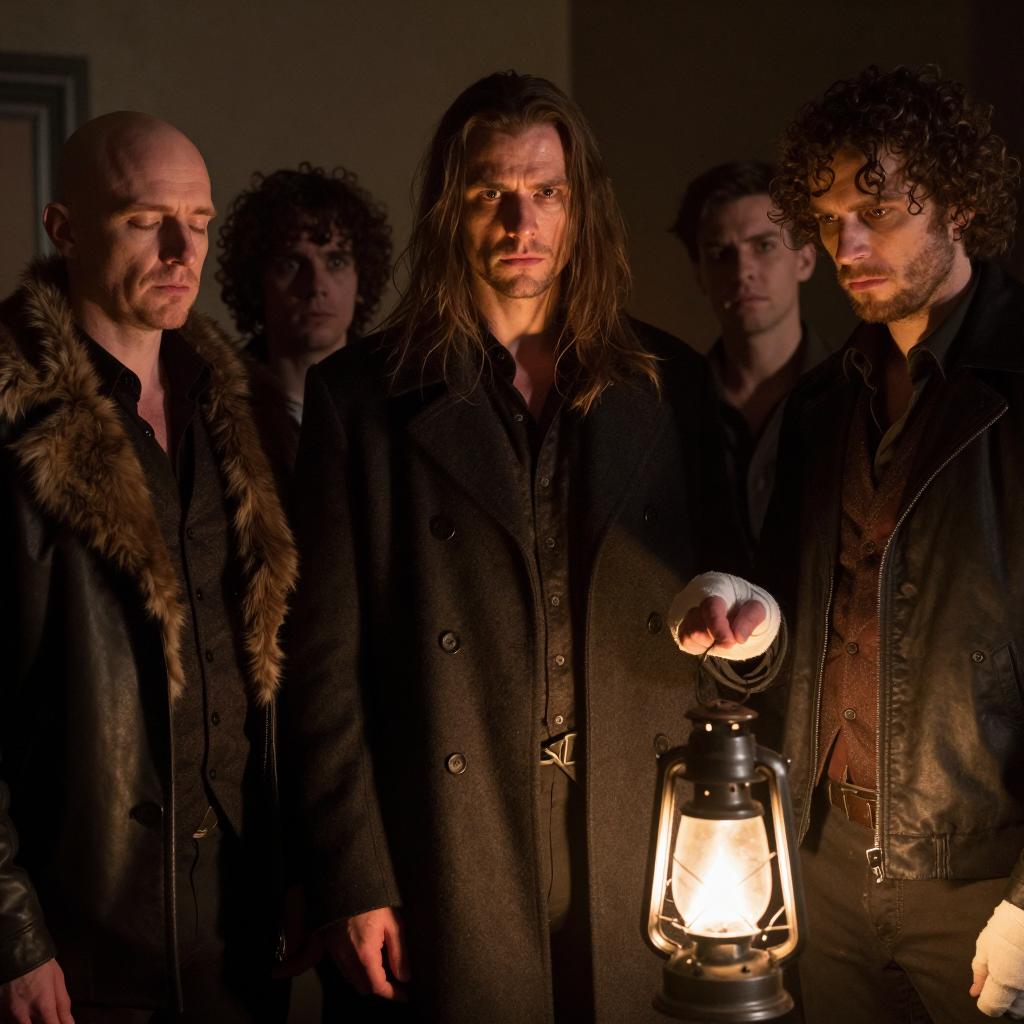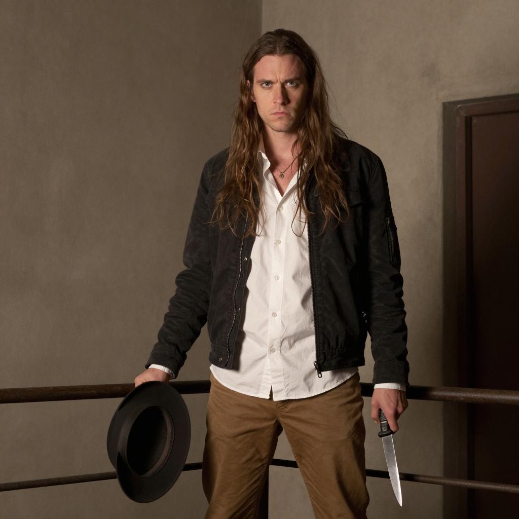 Man with long brown hair, wearing black jacket, white shirt, and brown pants, holds a hat in his right hand and a knife in his left. Standing on a metal railing in a dimly lit room with rough, ured walls. Intense expression.