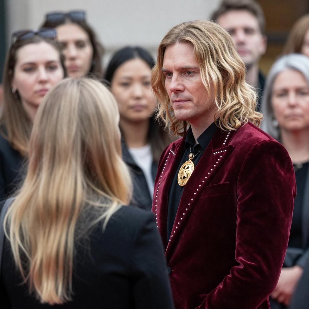 Photograph of a man with long, wavy blonde hair wearing a deep red velvet jacket adorned with silver studs and a large gold medallion. He stands in a crowd, facing a blonde woman with long hair, who has her back to the camera. The crowd, including women with dark hair and one older woman with grey hair, watches intently. The background is blurred, focusing on the man and woman.