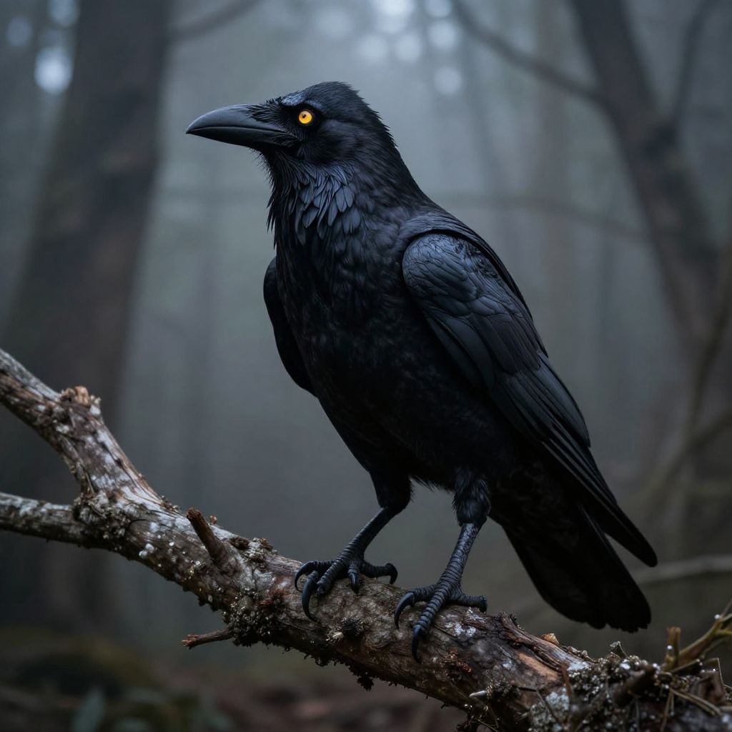 Photograph of a muscular, human-like creature with black feathered body and crow head, crouching on rooftop at dawn, shadow cast on ground