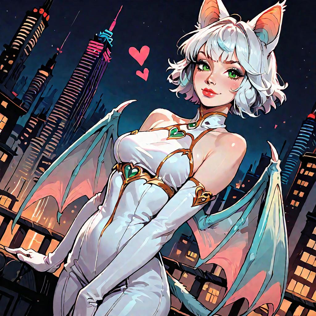 This is a vibrant, digital anime-style illustration of a white-haired, green-eyed female bat-like character with cat ears and translucent blue wings. She has a curvy figure with large breasts and wears a white, form-fitting, sleeveless dress with gold and green accents, and long white gloves. Her skin is fair, and she has a slight blush on her cheeks. Two pink hearts float above her head, and the background features a nighttime cityscape with tall, illuminated skyscrapers. The art style is colorful and dynamic, with sharp lines and vivid contrasts, emphasizing a futuristic, urban setting.