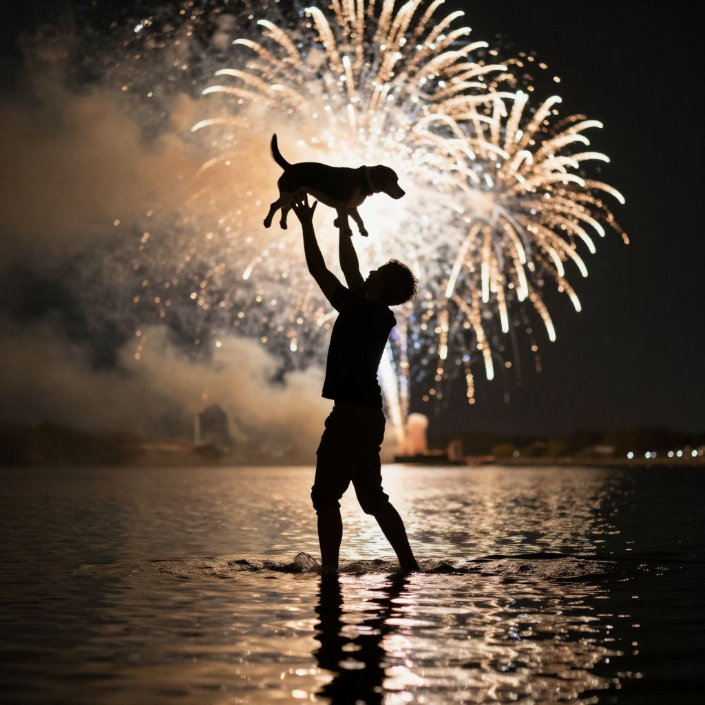 Man throwing a beagle in the air while standing in water with fireworks in background, full body, silhouette, reflection in water, volumetric lighting, golden ratio, backlit