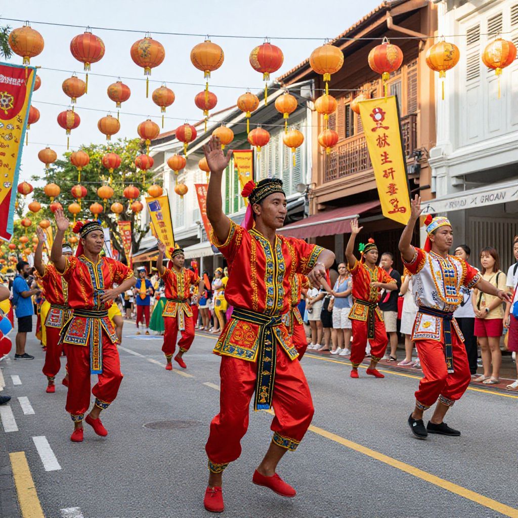 Singaporean cultural festival with traditional dancers in bright ethnic costumes performing on vibrant street decorated with lanterns and festive banners, energetic composition, rich colors, warm sunlight