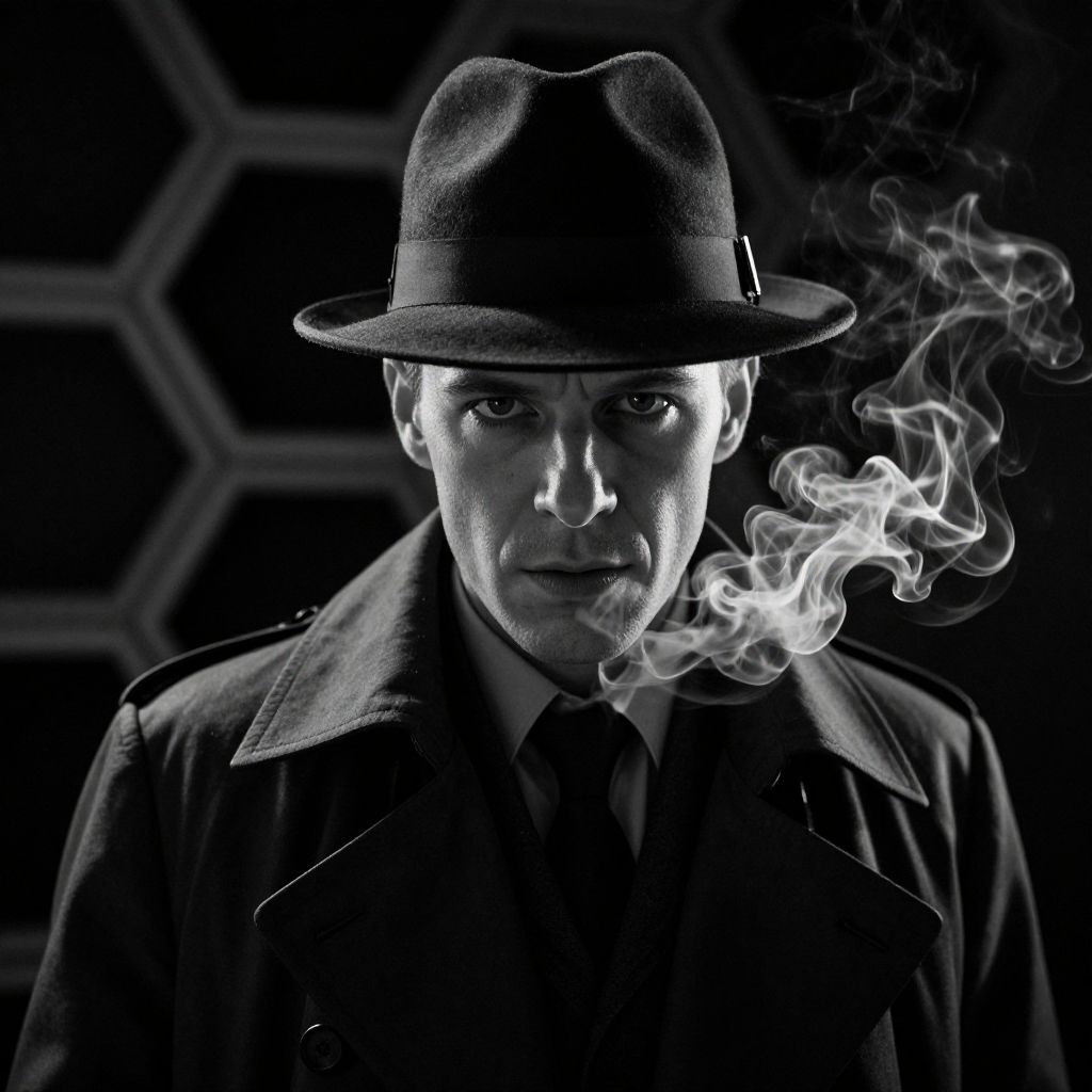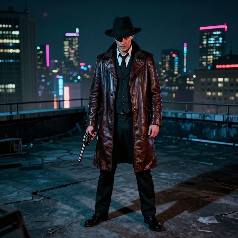 Photograph of a man in a black leather trench coat, fedora, and white shirt, standing in a dimly lit, cluttered room with