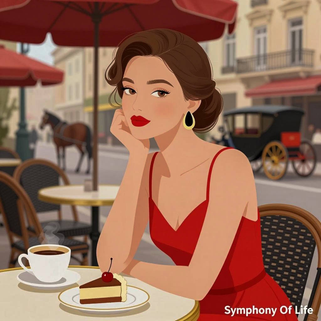 Illustration of a woman with fair skin, brown hair in an elegant updo, wearing a red sleeveless dress, sitting at a café table. She has red lipstick, large earrings, and is resting her chin on her hand. On the table, a cup of coffee, a small plate with a slice of cake, and a red cherry are visible. The background features a painted street scene with red umbrellas, a horse-drawn carriage, and European-style buildings. The artist's name "Symphony Of Life" is in the bottom right corner.