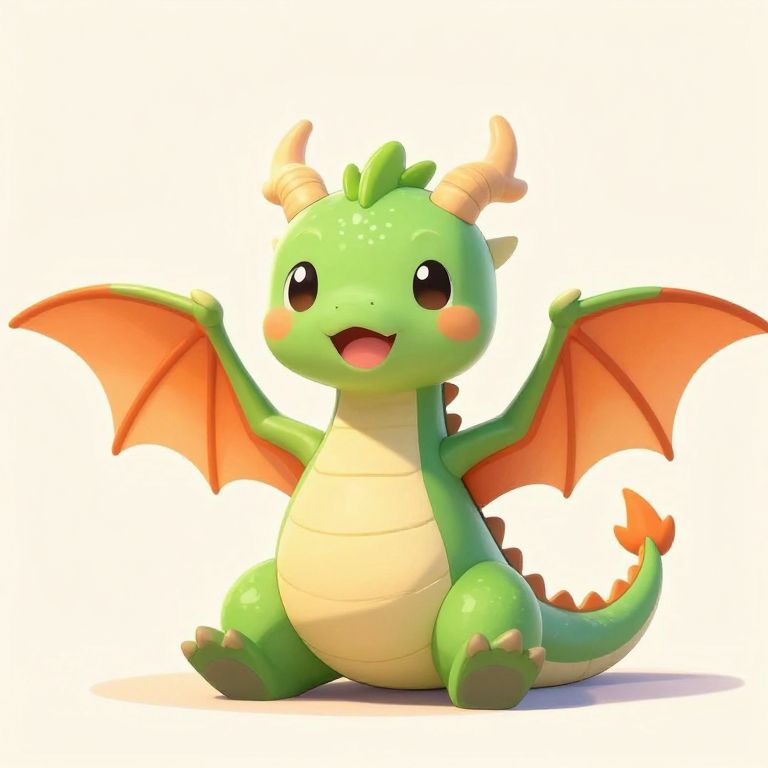 Cute green dragon sitting upright with orange wings spread wide, featuring two curved horns, spiky dorsal fins, and a playful expression against a soft background.