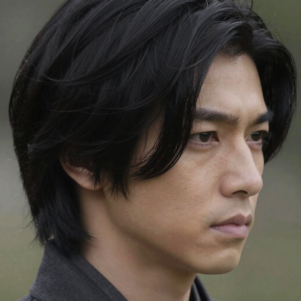 Hiroyuki Sanada hair close-up portrait, intricate layered black hair with subtle waves, natural shine, detailed strands, traditional Japanese aesthetic, high-resolution, soft lighting highlighting texture and depth, cinematic style inspired by classic samurai films.