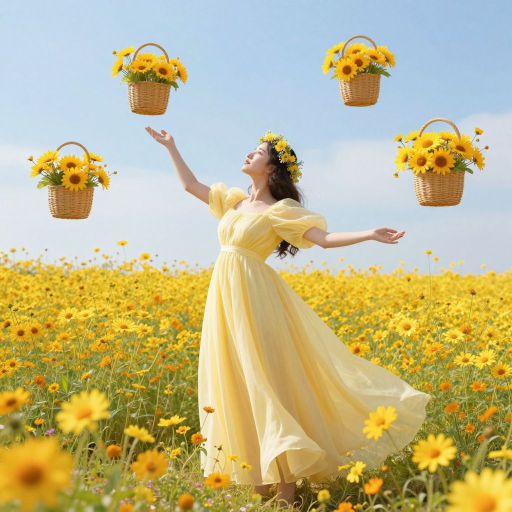A woman in a flowing yellow gown stands amidst a field of golden flowers, her arms outstretched as floating baskets brimming with sunlit blooms drift around her, evoking a dreamlike scene rendered in hydrochromic hues and imbued with the ethereal quality of digital art.