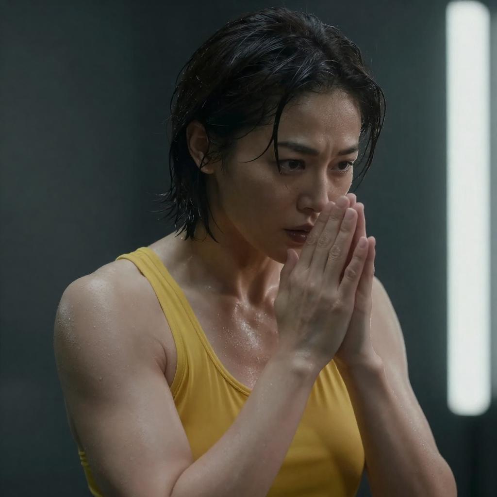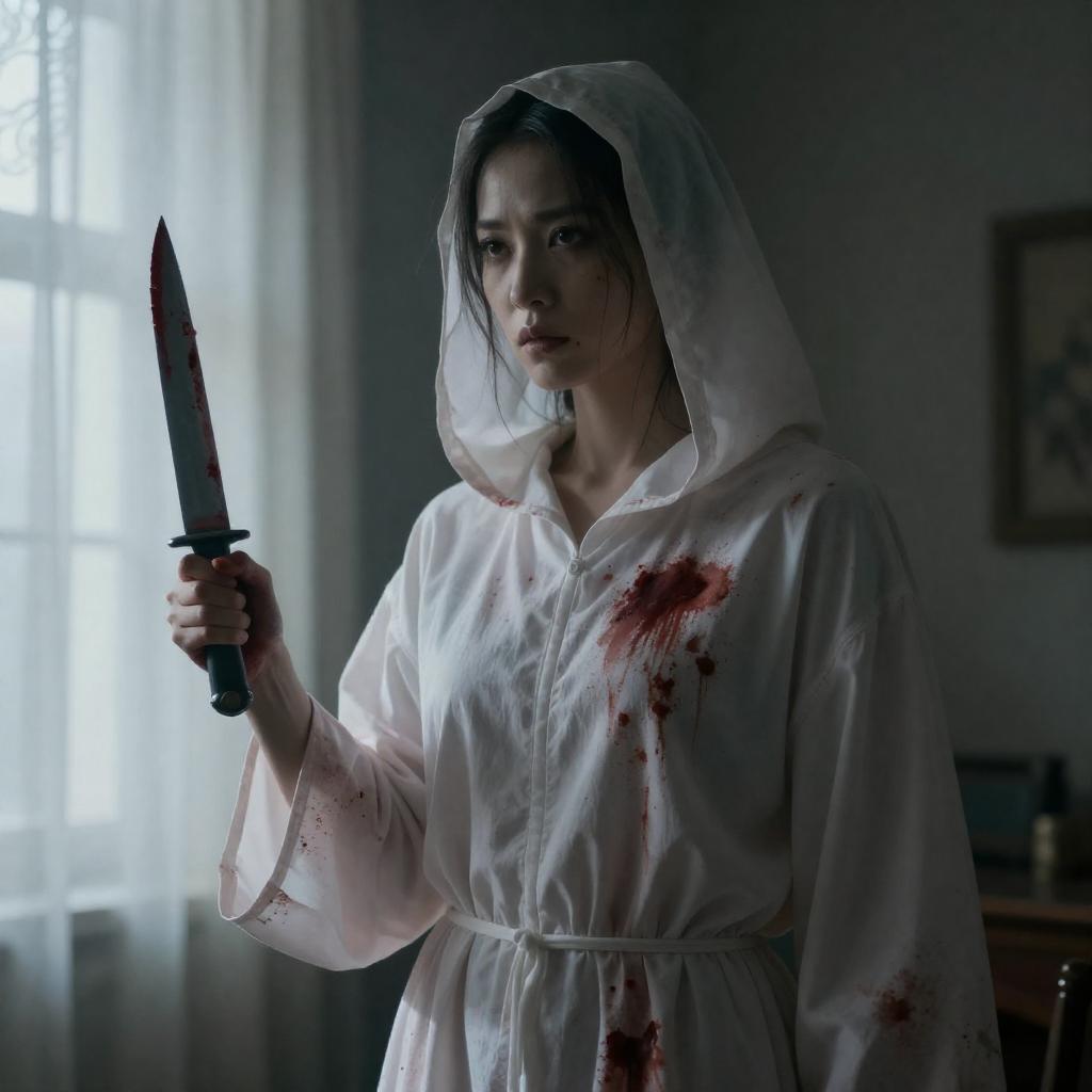 A woman with dirty, wet black hair and blood on her face is hit in the face with a glass bottle. She has a startled, pained expression. She is wearing a red shirt, and is partially hidden by wooden slats. The background is dark and dimly lit.