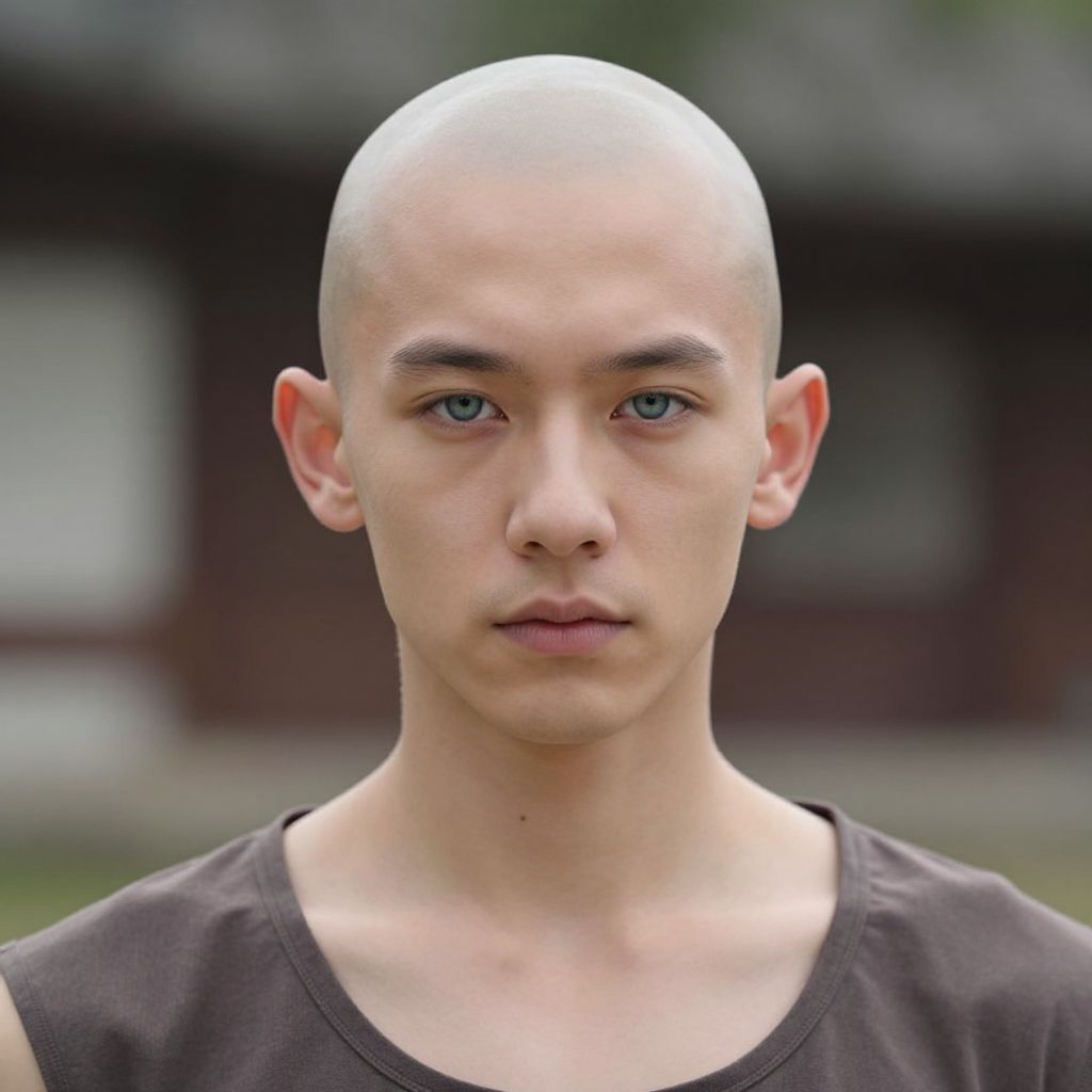 Bald character costume, solo, 1boy, male focus, bald, realistic, looking at viewer, blue eyes, blurry, blurry background, old, day, outdoors