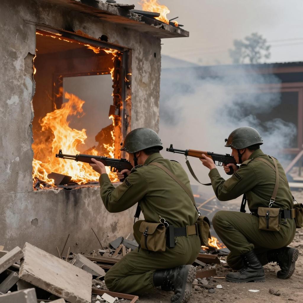 Two soldiers in green uniforms and helmets crouch against a burning, rubble-filled building. Both hold rifles, aiming forward. Flames and smoke fill the background. One soldier's face is partially obscured by his helmet. Debris and broken structures scatter the ground. The scene is intense and chaotic.