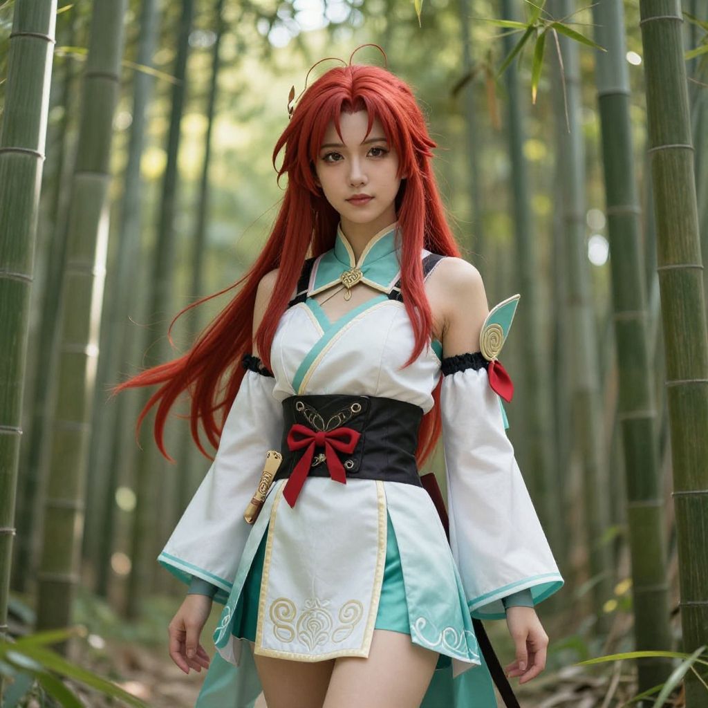 Photograph of an Asian woman with long, red hair wearing a white and teal anime-style outfit with gold accents and red ribbon. Her outfit includes detached sleeves and a short skirt with ornate designs. She stands in a bamboo forest, with tall bamboo stalks and green leaves in the background. The light filters through the bamboo, creating a soft, dappled effect. Her expression is serious, and she looks directly at the camera. The image has a slightly surreal, digitally enhanced quality, emphasizing the vibrant colors and details of her costume.