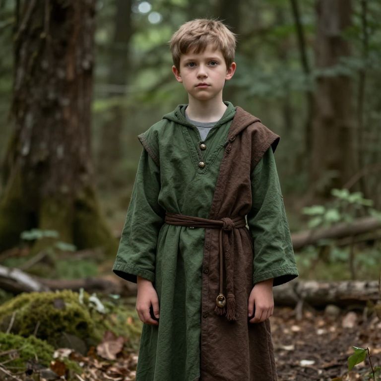 Druid, boy in a green and brown robe standing in the woods