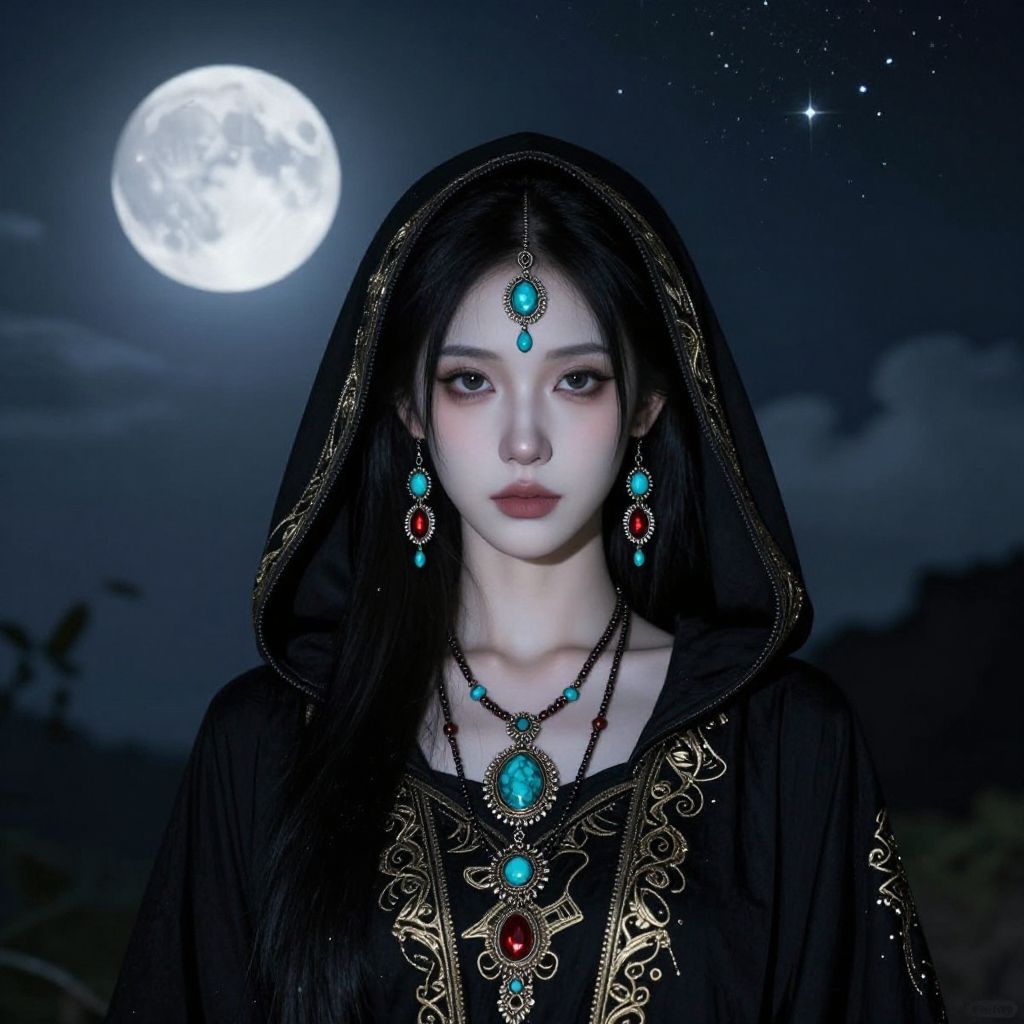 Digital artwork of a mystical young woman with black hair and pale skin wearing a black hooded cloak adorned with intricate golden designs. She has striking turquoise and red gemstone jewelry, including earrings, a forehead ornament, and a necklace. The background features a full moon, a starry night sky with scattered clouds, and silhouetted foliage, creating a mysterious and enchanting atmosphere.