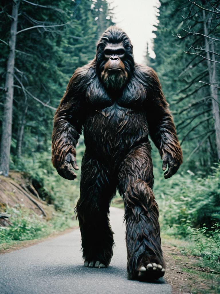 Man in Bigfoot Costume, cinematic realism, fantasy editorial photo