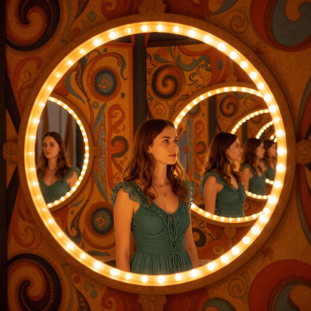 Circus mirrors illuminated by warm orange lights reflect multiple layered visions of a woman in a teal dress, revealing her contemplative gaze as she stands amidst an ornate backdrop of vibrant patterns and glowing circular frames.