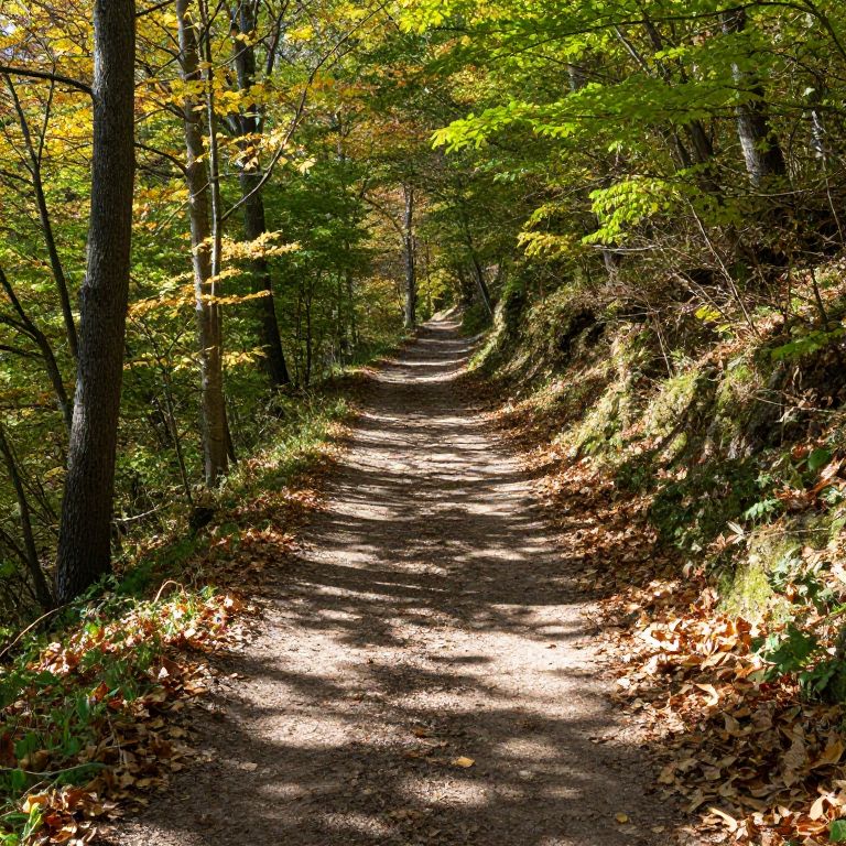 Photograph of a narrow, winding dirt path through a sunlit forest. The path is lined with tall trees, their leaves in various shades of green, yellow, and orange, indicating early autumn. Sunlight filters through the foliage, casting dappled shadows on the path, which is scattered with fallen leaves. The forest floor on either side of the path is covered with grass, small bushes, and more leaves. The background fades into a dense, tree-filled area, creating a sense of depth and tranquility. The overall scene is vibrant and serene, capturing the beauty of a forest in the fall.