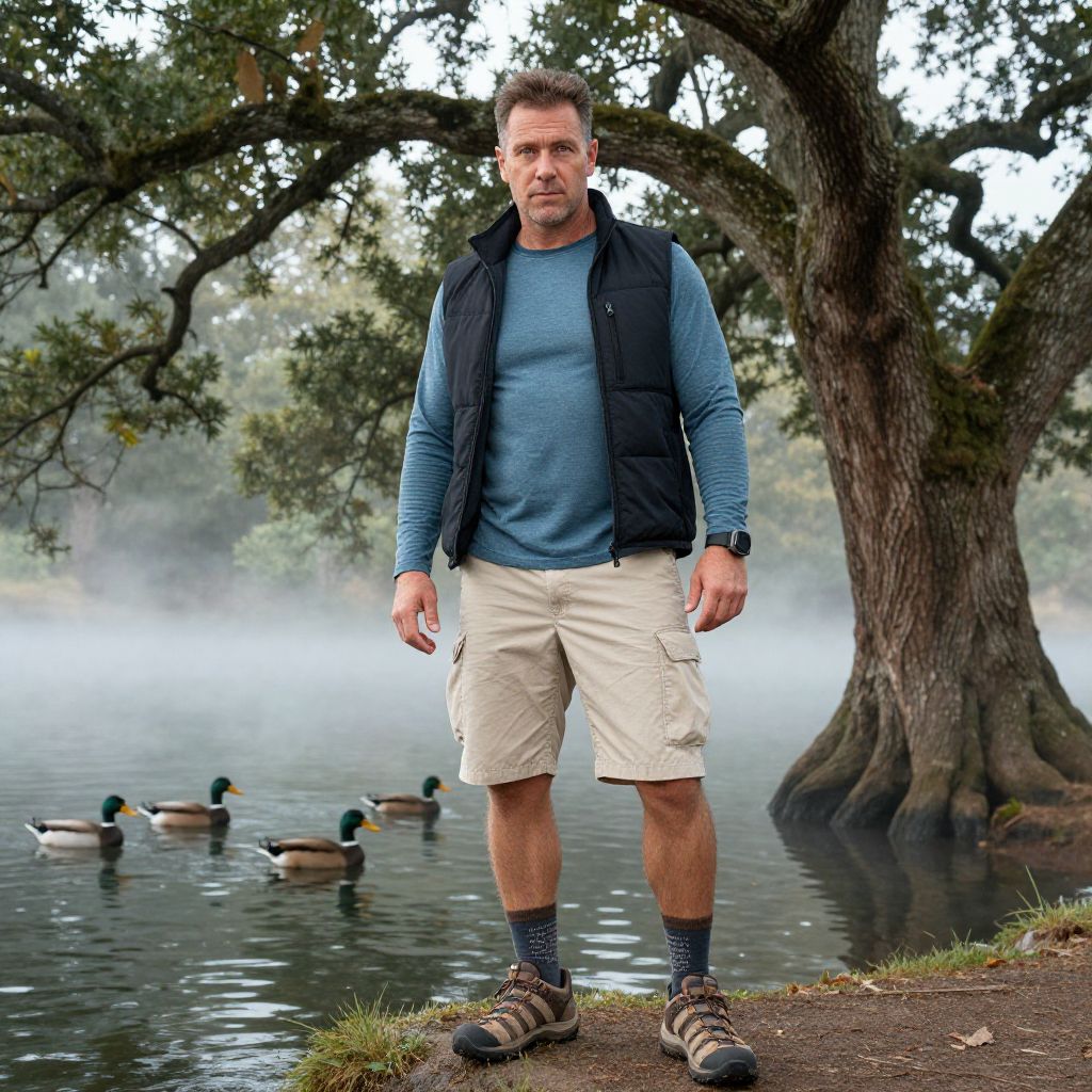 A man, performance tights in black, bright orange running vest, gray long-sleeve shirt, dark brown hiking shoes, lush green undergrowth, trickling stream, vintage photo style, focused expression Man has masculine face and piercing eyes