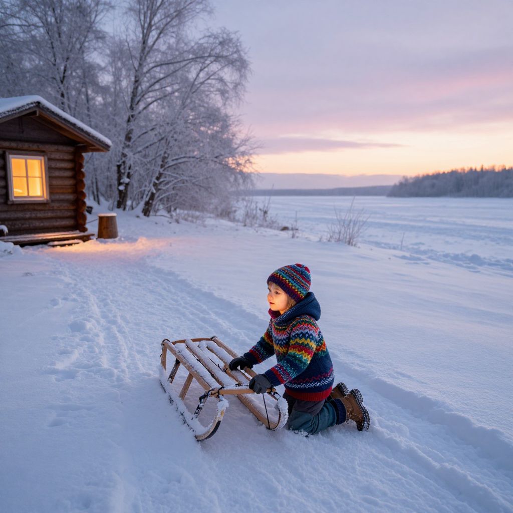 An aerial perspective captures a heartwarming scene where a young child, dressed in a vibrant handcrafted sweater, kneels beside a snow-covered sled in the rustic setting. The warm glow from a nearby cabin illuminates their face, creating an intimate atmosphere. The background features a serene winter landscape with frosty trees and a vast snowy expanse that extends to the horizon, reflecting both innocence and profound beauty found in simplicity. The style is reminiscent of dreamlike qualities, blending elements of Russian folklore with modern sensibilities, evoking an emotional gradient that captures the essence of this moment.