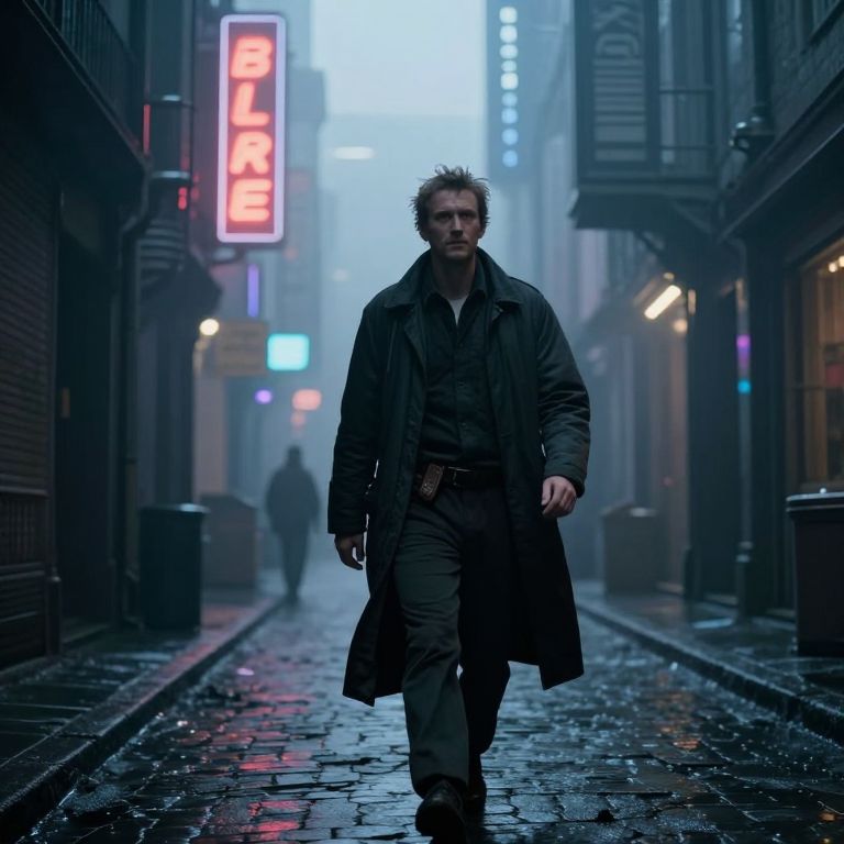 Pieter Brueghel film still, blade runner walking through a foggy alley at dusk, neon signs, futuristic city, shot by roger deakins,
