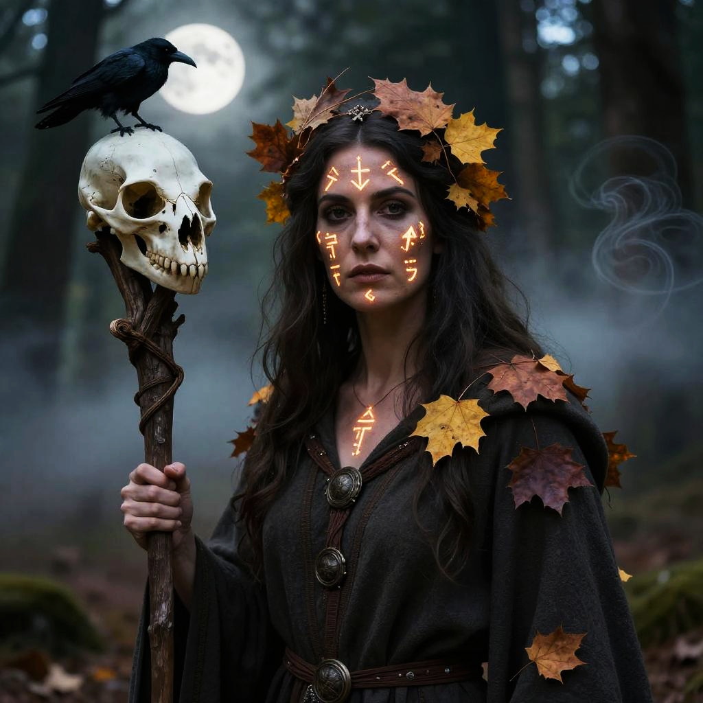 Samhain themed portrait of a wise druid woman, painted face decorated with autumn leaves and glowing runes, deep forest background with soft moonlight and swirling mist, holding a staff topped with a raven skull, ancient spiritual power and mystery in the scene