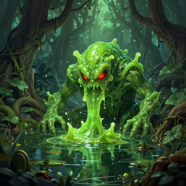 Digital art of a glowing green, slime monster with red eyes emerging from dark, dense jungle water, surrounded by vines and leaves.