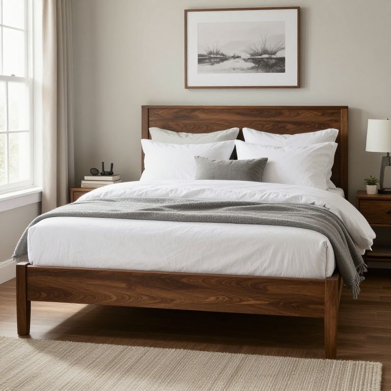 Photograph of a modern bedroom featuring a wooden bed with a dark, polished finish. The bed is made with crisp white linens, two large white pillows, and a smaller gray pillow. A gray throw blanket is neatly draped across the bed. Flanking the bed are two wooden nightstands, each with a small white lamp. Above the bed, a black-and-white framed landscape photograph hangs on a light gray wall. Natural light streams in from a window on the left, partially covered by light gray curtains. The floor is hardwood with a beige woven rug.