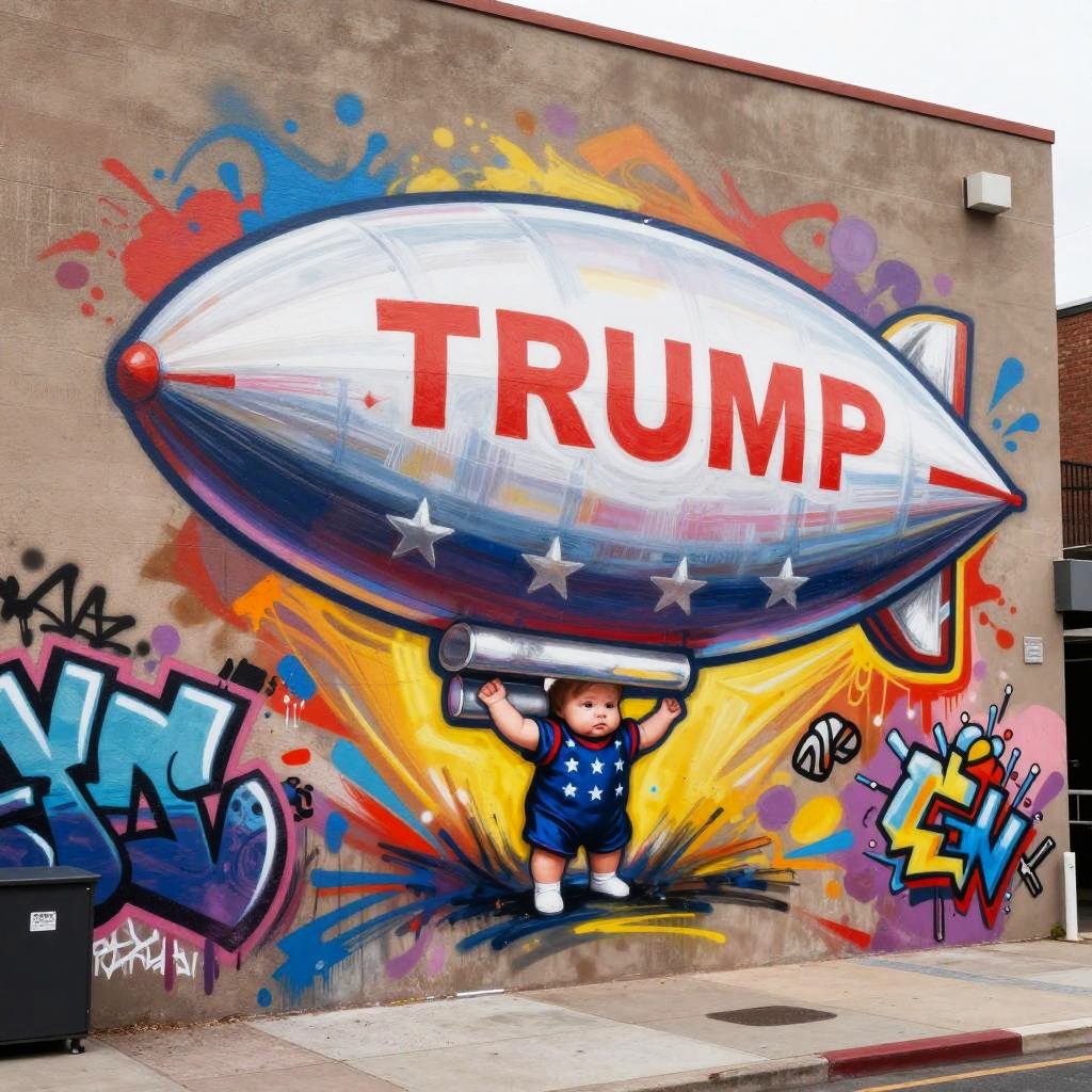 Trump baby costume, street art graffiti style mural of the Trump baby blimp, colorful and dynamic, urban wall setting, expressive brush strokes, contemporary political art