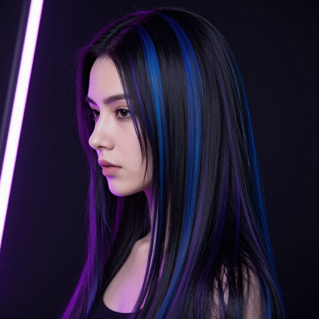 Highlights in black hair featuring deep blue and violet streaks, sleek straight hair styled elegantly, contrasting against a dark background with vibrant neon light reflections, futuristic cyberpunk aesthetic, ultra-realistic digital art, sharp focus