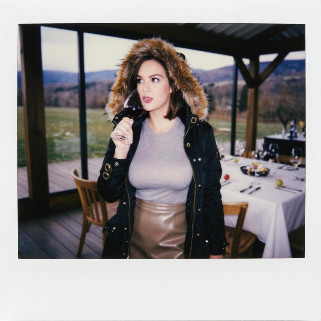 A woman in a black parka with gold-tone hardware and a faux fur-lined hood, paired with a grey long-sleeve T-shirt and a khaki faux leather skirt, enjoying a wine tasting villa, captured in the style of a polaroid instant camera. Sexy. Pretty face and beаutiful eyes. Big breasts