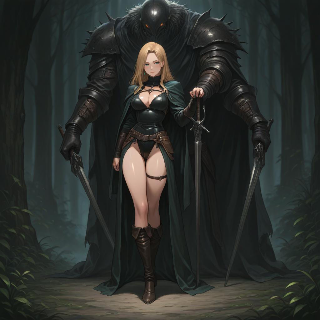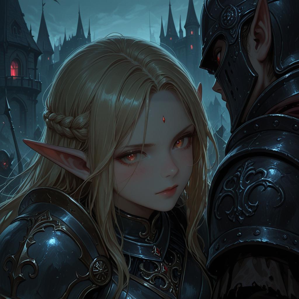 Highly detailed, High Quality, Masterpiece, beautiful, ApproachingMe, , 1girl, single mechanical arm, prosthesis, MaleniaDef, armor, cape, helmet, brown dress, LetMeSoloHer, pot helmet, topless male, 1boy