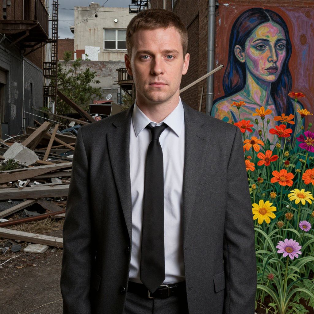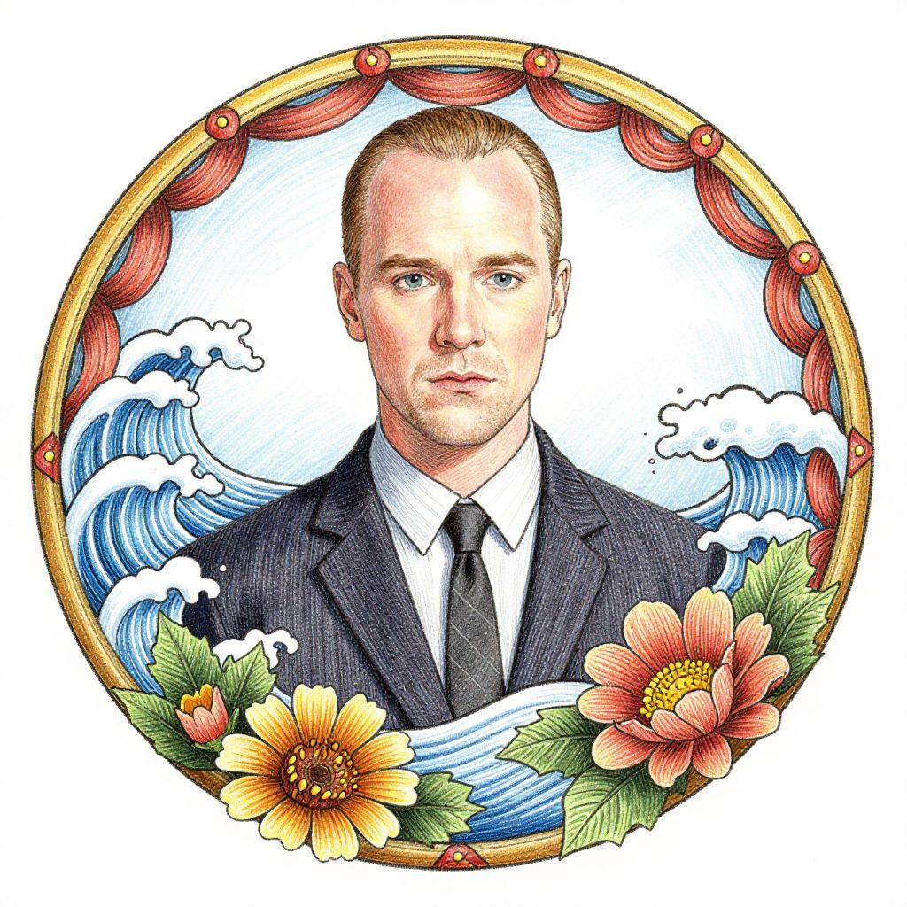 Colorful digital illustration of a serious, blonde man in a black suit and tie, framed by red curtains, ocean waves, and vibrant flowers.