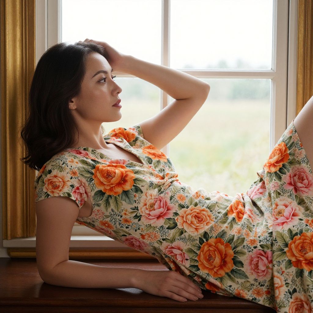 Photograph of a young woman with light olive skin and dark brown hair, reclining on a windowsill. She wears a floral dress with vibrant orange, pink, and white roses on a green background. Her right arm is bent, hand resting on her head, while her left arm is laid out on the windowsill. She gazes thoughtfully outside, illuminated by natural light streaming through the window behind her. The background includes gold curtains and a white-framed window, creating a soft, warm ambiance. The texture of the dress is slightly ruffled, adding a delicate touch to her relaxed pose.
