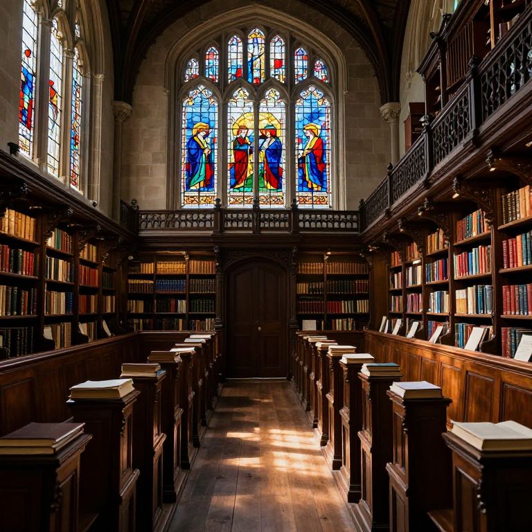 Stained-glass windows cast vibrant hues across a grand library, where rows of ornate wooden pews flank a central aisle strewn with open books, creating a mesmerizing blend of light, literature, and architectural splendor.