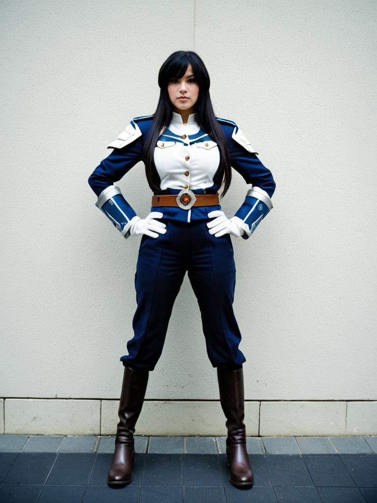Photo-realistic cosplay photo of person in morag ladair (xenoblade) costume. Full body. Standing. Full length. 1girl, brown eyes, hair between eyes, black hair, long hair, military uniform, white gloves, military uniform