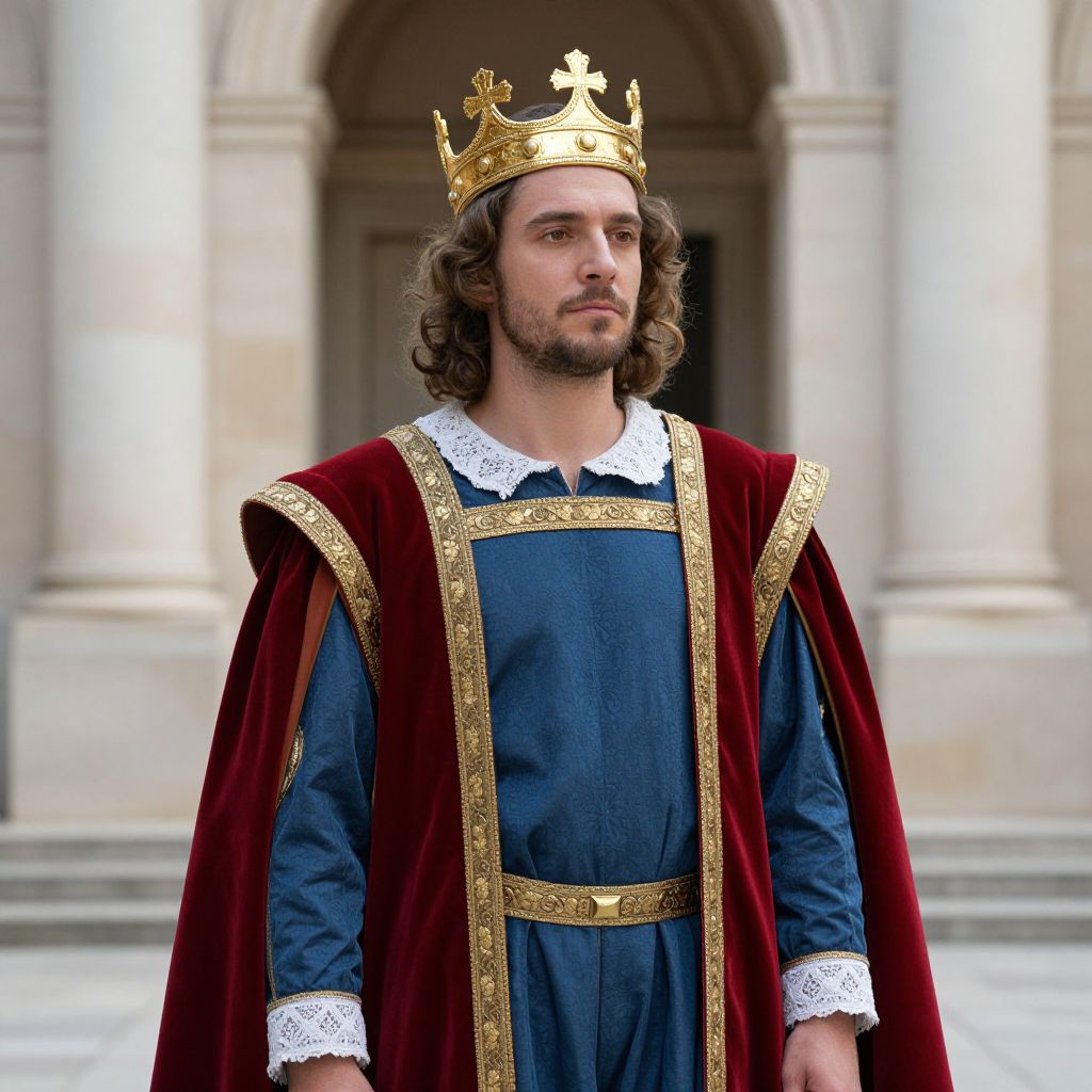 Photograph of a Caucasian man with long, wavy brown hair and a beard, wearing a golden crown with cross motifs. He is dressed in a medieval-style royal outfit consisting of a blue tunic with white lace trim, adorned with a gold-bordered red velvet robe. The man stands in front of a grand, classical architectural background with large, white columns and an arched doorway. His expression is serious and contemplative, and the lighting is natural, highlighting the textures of his clothing and the stone architecture behind him.