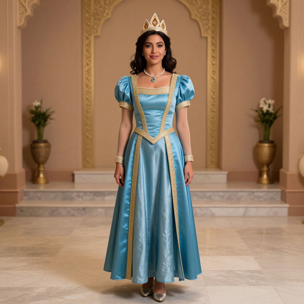 Genie Costume Aladdin Female, a woman in a blue dress and a crown standing in a room