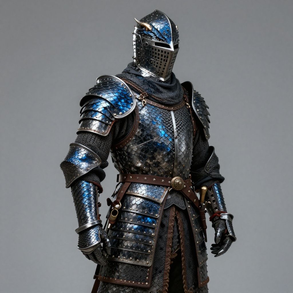 Hyper-realistic, Realism, HDR, detailed, medieval warior style, black-blue dragon scales, armor with (tunic / hauberg /rustic jaket), simple gray background