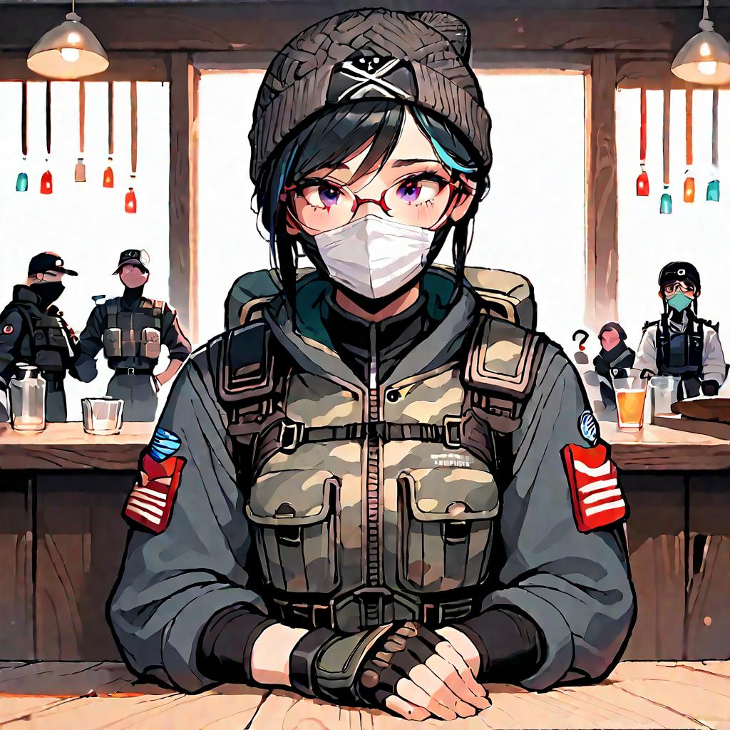 Score_9, score_8, score_7, source_anime, indoors, bar, drunkdokkaebi, dkdef, fingerless gloves, bodysuit, round eyewear, beanie, body armor, annoyedtsangfrst, frstdef, black hair, mouth mask, jacket, bulletproof vest, surprisedela, military uniform, camouflage, baseball cap, goggles on headwear, worried