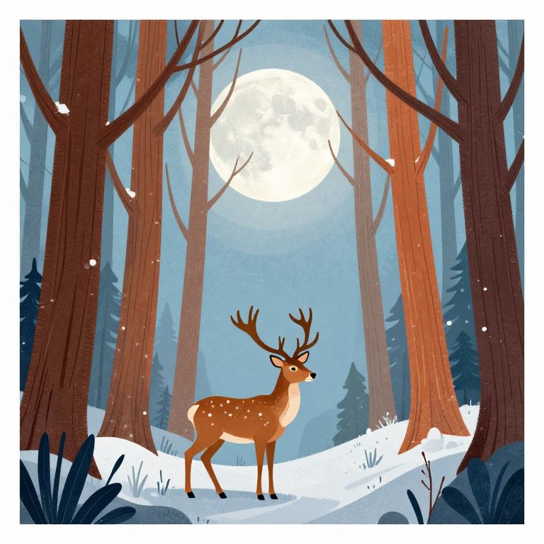 Portfolio artwork of deer and moon in the snowy wooden forest, in the style of fictional landscapes, dark orange and light azure, i cant believe how beautiful this is,