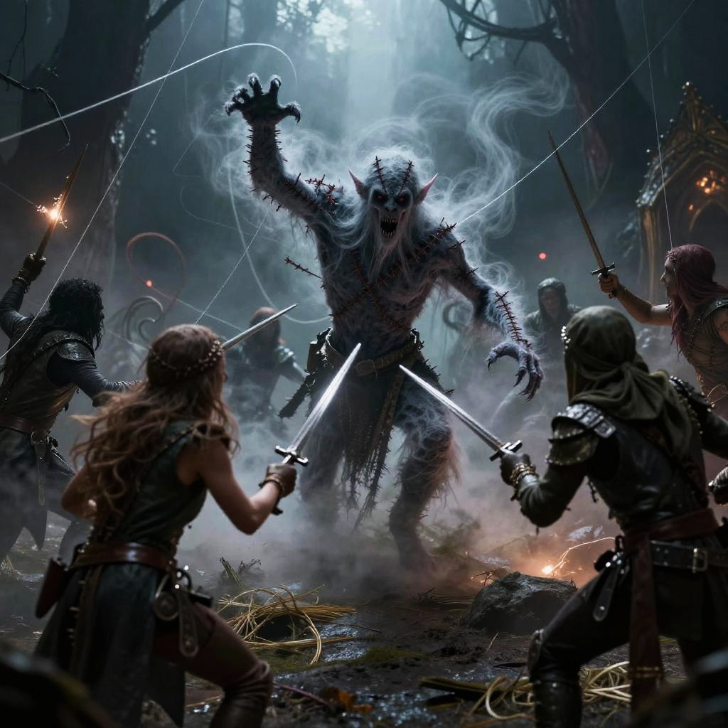 Epic fantasy battle scene featuring a stitchwraith confronting a group of adventurers, ghostly stitched creature wielding spectral threads as weapons, dark mist swirling around, dynamic composition with dramatic lighting, richly detailed supernatural environment.